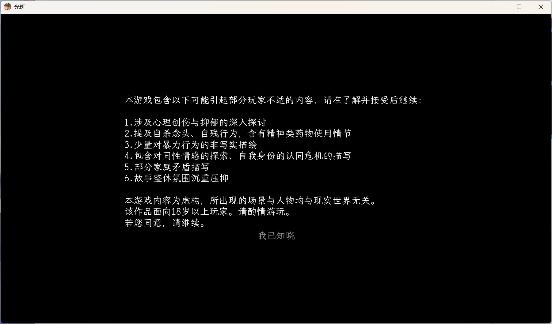 本作深入探讨了青少年自我成长相关的主题,包含对同性情感的探索、自我身份的认同危机的描写,以及家庭矛盾的刻画,还有少量对暴力行为的非写实描绘。此外,游戏中还存在自杀念头、自残行为的描述,涉及心理创伤与恢复的过程,可能引发相关经历者的不适。故事整体氛围沉重压抑,请以照顾好您的情绪为前提,阅读此作品。